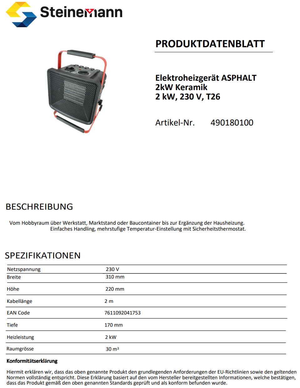 2 kW, 230 V, T26 Vom Hobbyraum über Werkstatt, Marktstand oder Baucontainer bis zur Ergänzung der Hausheizung. Einfaches Handling, mehrstufige Temperatur-Einstellung mit Sicherheitsthermostat.