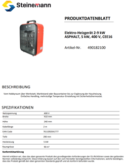 5 kW, 400 V, CEE16 Vom Hobbyraum über Werkstatt, Marktstand oder Baucontainer bis zur Ergänzung der Hausheizung. Einfaches Handling, mehrstufige Temperatur-Einstellung mit Sicherheitsthermostat.